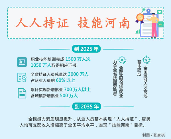 为推动劳动者技能就业、技能增收,加快实现人口数量红利向素质红利转变,省委办公厅、省政府办公厅近日印发《高质量推进“人人持证、技能河南”建设工作方案》(以下简称《方案》),提出到2025年,全省持证人员总量达3000万,基本建成全国技能人才高地,到2035年,从业人员基本实现“人人持证”,实现“技能河南”目标。
